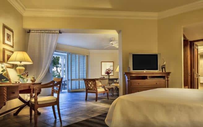 The 28 suites vary in size and have their own terrace or balcony. The Garden View Junior Suites (86mΒ²) have their own sitting area whilst the Garden View Senior suites (106mΒ²) have a separate sitting room with TV & DVD/CD player. The Colonial suites (either Ocean View or Ocean Front ) are decorated in a refined colonial style with sumptuous four poster bed, separate sitting room with computer (complimentary internet access), TV & DVD/CD player. Many of the rooms and suites can take an extra child (or two children in the case of some of the suites) and suites can interconnect with an adjacent room to provide a two bedroom family suite.