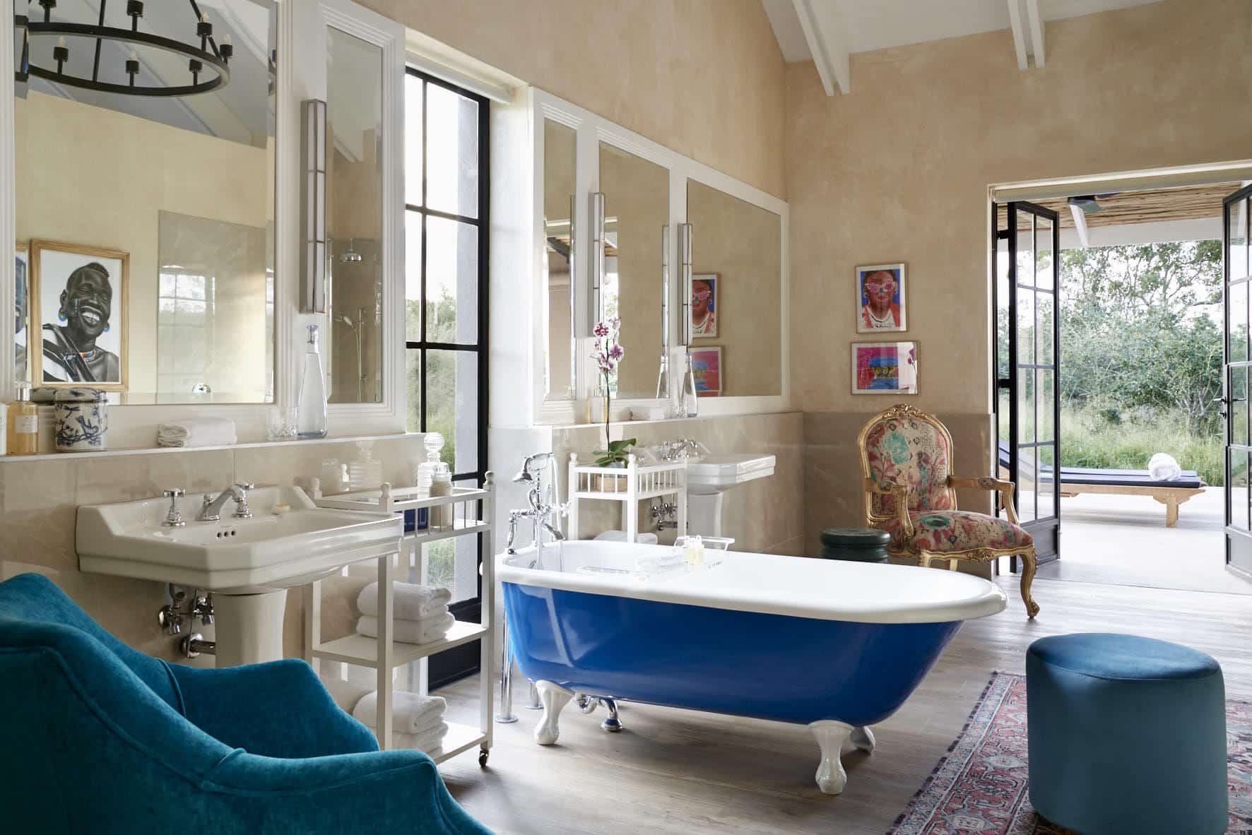 The second property is the exclusive Africa House villa. Filled with colour and character, Africa House lies only a few minutes’ drive away. It accommodates up to 12 people in complete splendour – the perfect child-friendly bush paradise for families or friends. Enter the imposing North African front door and feel the calm of the central courtyard with its cooling fountain, twin casitas and spacious covered veranda. Generous living and dining areas in the safari villa lead onto another covered veranda where you can relax on the day beds, swim in the pool and enjoy leisurely meals in a magical bush setting. Africa House comes with a private chef, butler, ranger, tracker and game drive vehicle, as well as its own Boma for starlit dinners around the campfire.