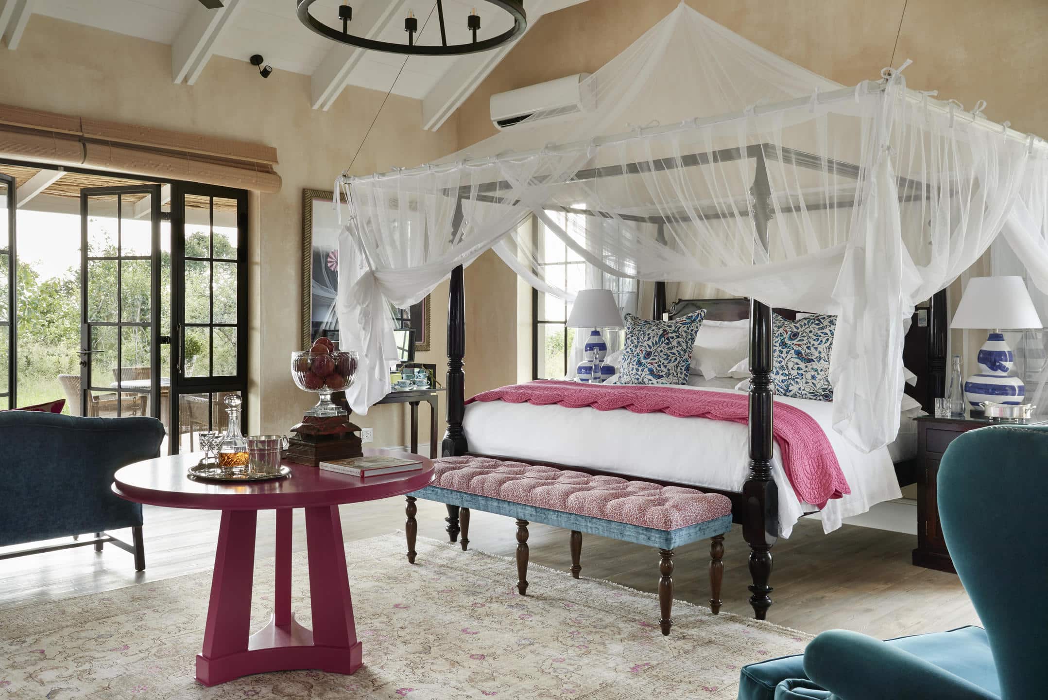 Elevated walkways link six private suites, each surrounded by its own spacious deck with a private plunge pool shaded by trees, with a delightful thatched sala for afternoon siestas. Each suite has a large air-conditioned bedroom/sitting room with open fireplace, minibar and antique canopy king size bed. The extravagant bathroom is full of light, the epitome of indulgence with a Victorian bath and indoor & outdoor showers.