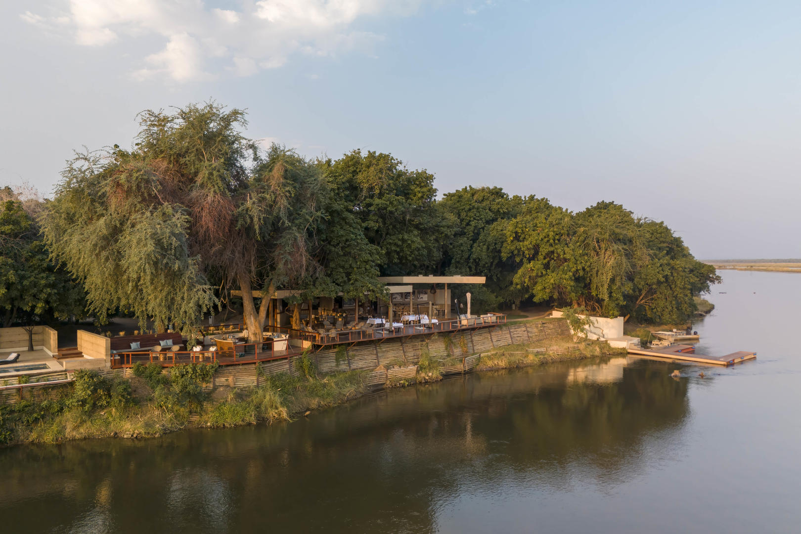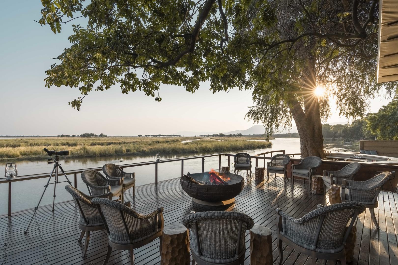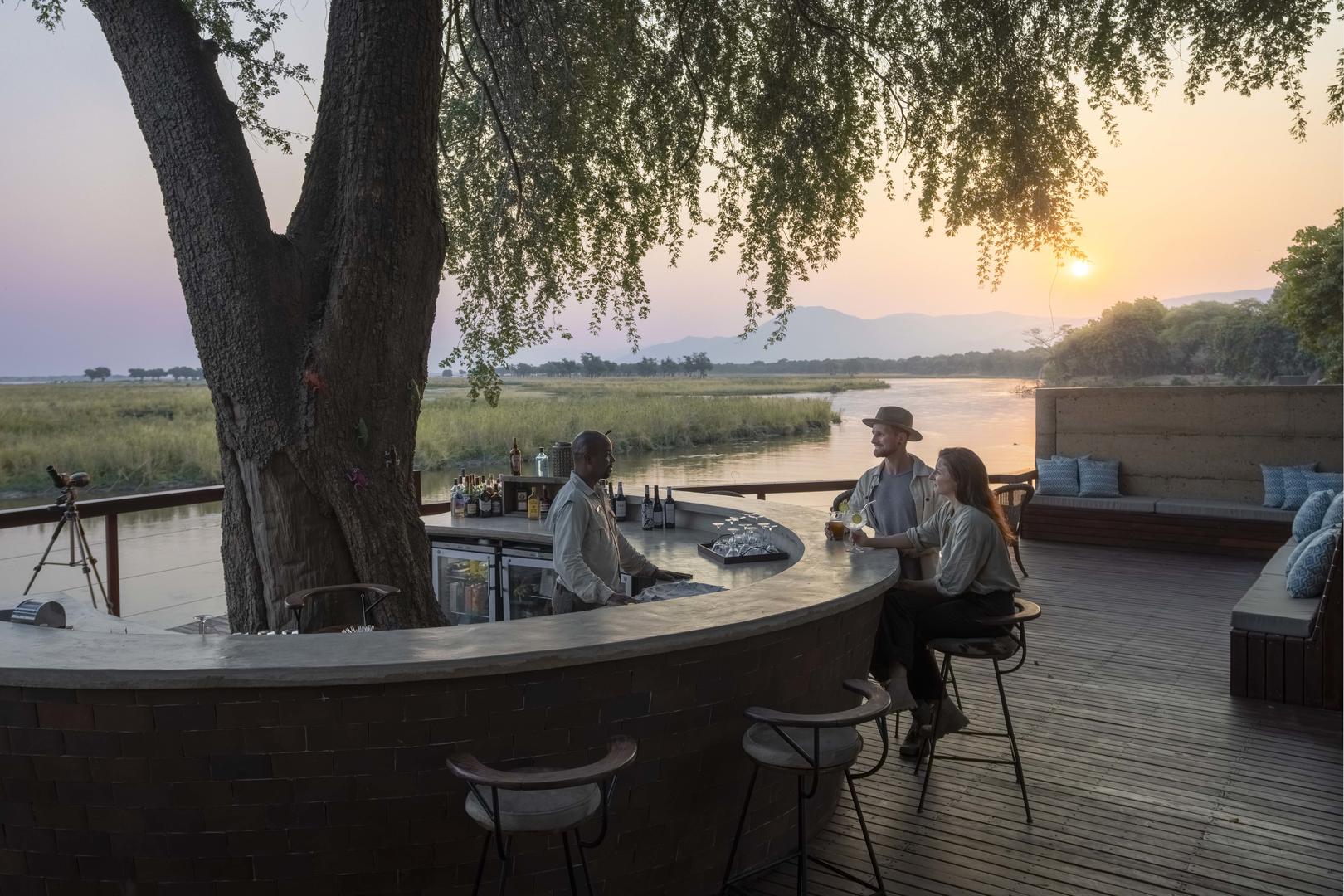 Sausage Tree Camp is situated in the heart of the Lower Zambezi National Park in Zambia on the banks of the glorious Zambezi River. Sausage Tree Camp is perhaps the most romantic of all the Lower Zambezi camps and thus particularly recommended for honeymoons in Zambia. The main lodge is open plan under an extensive canvas with an expansive teak deck overlooking the Zambezi river - perfect for sundowners. The 25 metre lap pool is idyllically situated right on the edge of the riverbank, under shading Mahogany trees with outstanding views. Sun loungers are on hand for relaxing during the heat of the day.