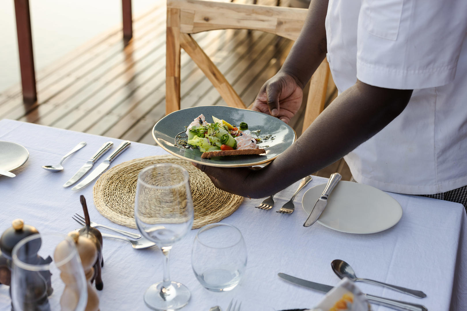 Good food is also an important part of any stay at Sausage Tree Camp, with delicious lunches in a variety of settings. Sundowners are enjoyed watching the sun set over the Zambezi escarpment of Zambia from the deck. Dinner is served by candle light in the open air dining tent, by star light on the deck, by moonlight on an island in the Zambezi, by campfire light deep in the bush, or by lantern light in the privacy of your own deck. There is a silent generator available for 24 hour power.