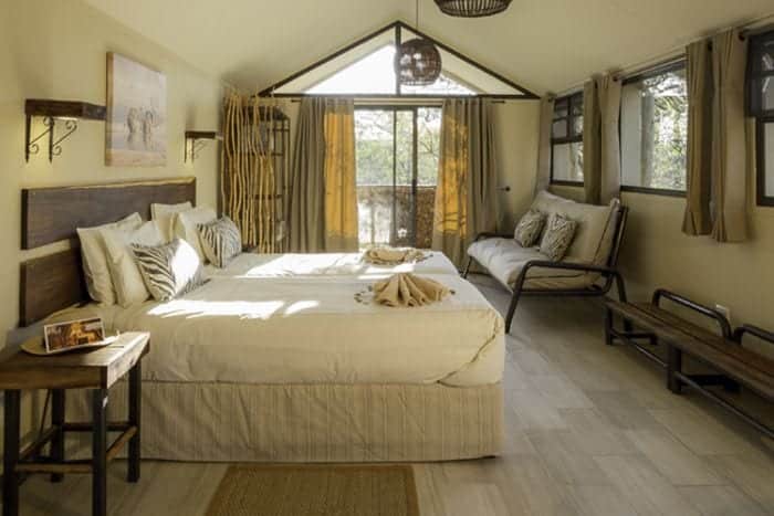 Taleni Etosha Village is styled like a traditional African village, but with modern comforts! Uniquely positioned amongst theΒ an indigenous Mopane forest, the accommodation units ensure maximum privacy and tranquility. The 45Β luxury individual suites offer a fully air-conditioned bedroom with an modern en-suite bathroom and a patio to enjoy the beautiful surroundings.Β Two small children (under the age of 12 years) can be accommodated on the fold-out sleeper couch.