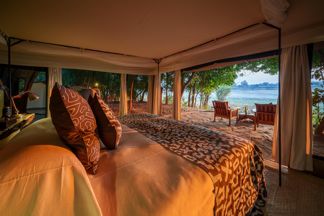 Tena Tena is sandwiched between the river and a lagoon system and is a magnet for wildlife and you do not need to go far for some incredible sightings. The camp nestles under a magnificent grove of mahogany trees which shades six large custom-made tents (under thatch) with massive picture windows. Each is positioned to maximize privacy with private verandas offering stunning river views. An en suite open air bathroom is designed to copy nature with curved walls around the trees and simple subtle colours. Tena Tena is run entirely by solar power so the rooms have electricity throughout the day and night.