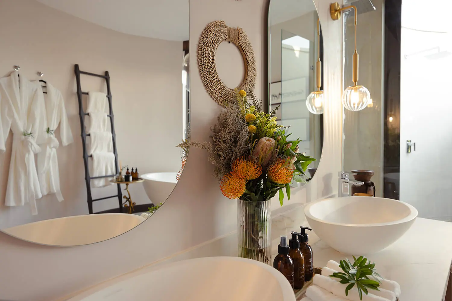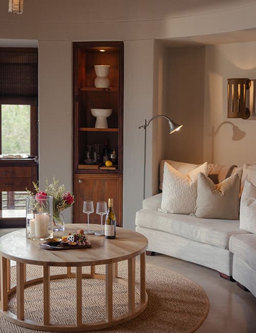 Each of the nine enormous luxury bush villas (220 sqm) has their own plunge pool, large sun deck with a sala for those all-important afternoon siestas, spacious sitting room, double sided fireplace, spacious indulgent bathroom and indoor and outdoor showers. Step out onto your wooden deck, take a dip in your heated pool or admire the African sunset from your circular daybed in the thatched outdoor sala.