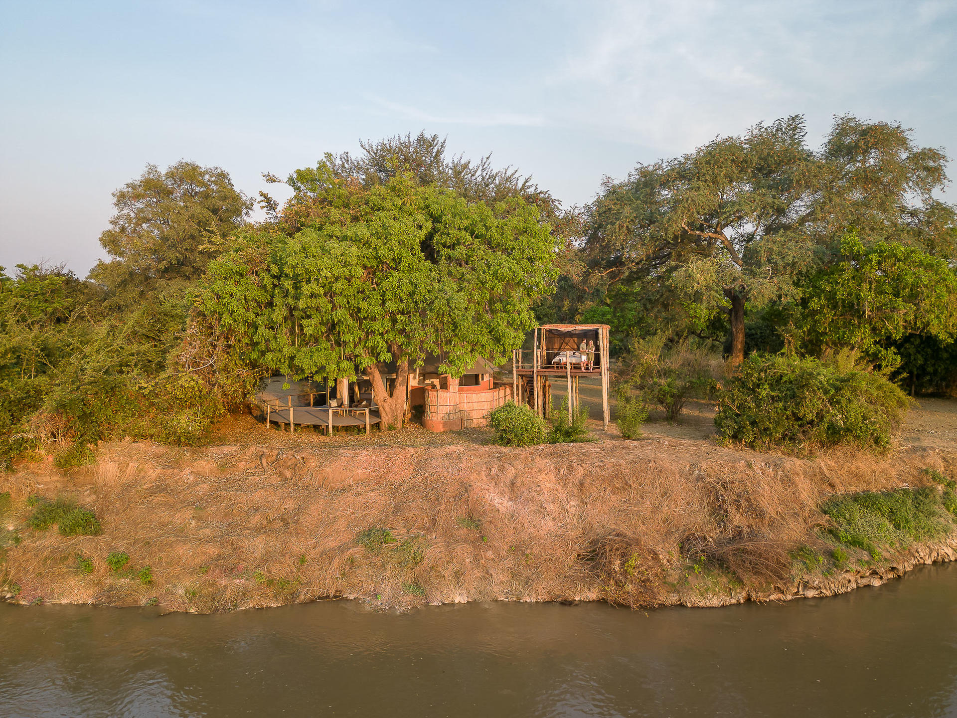 Three Rivers Camp is an intimate camp with only 5 spacious tents, elegantly decorated with natural materials and earthy hues. These tents lay under shady sausage trees and are facing either the Luangwa River or the game-rich lagoon. With their large gauzed windows you have extensive views of the Luangwa River and the lagoon. The en-suite semi-open bathrooms include indoor and outdoor showers, double sinks and flushing toilets.