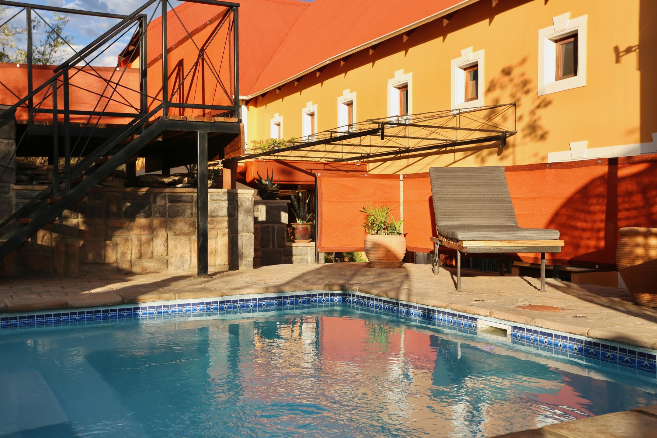 Ti Melen Boutique Guesthouse is situated on a hillside with grand views of the surrounding mountains. It lies in the tranquil suburb of Avis on the outskirts of the capital city of Windhoek. The interior design is contemporary with an African flair. The spacious architecture is inspired by the style of the colonial era.Β Β Ti Melen is surrounded by nature, whilst offering the advantage of being only 5 minutes by car from the city centre. Ti Melen has only six rooms and a shaded courtyard with swimming pool.