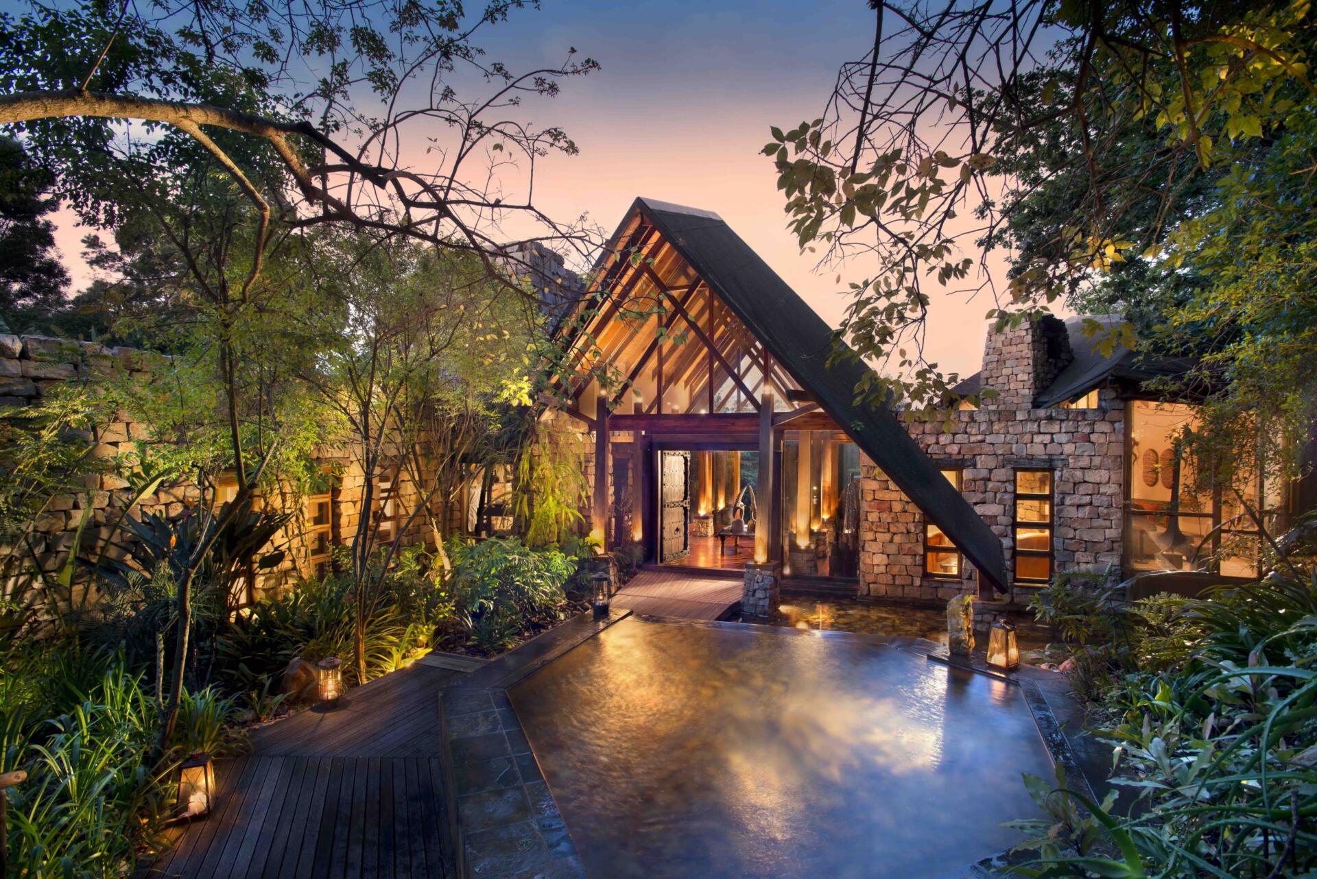 Ten luxurious suites set on stilts rise above the forest canopy with enchanting views down to the Piesang River valley. Elevated wooden walkways take you to your timber suite. Which is decorated in a contemporary African style using natural colours and textures. Each has a separate sitting area, double fireplace for romantic winter evenings, ceiling fan, a bathroom with a freestanding oval stone bath and indoor & outdoor showers. Outside your suite is a balcony to the front and a private wooden deck complete with infinity pool suspended above the forest floor.