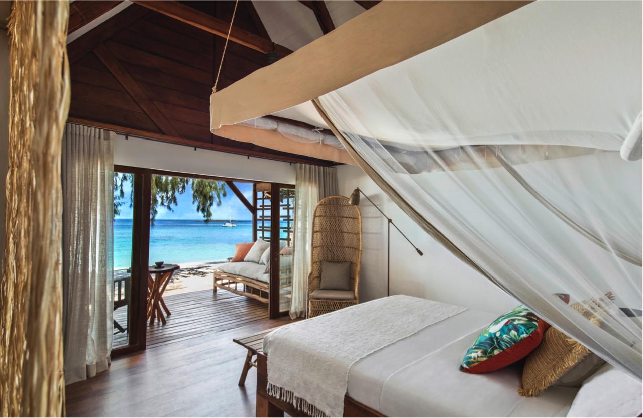 The thatched villas at the Constance Tsarabanjina offer the ultimate in castaway luxury . Using only natural materials the spacious villas combine Malagasy art with an elegant modern style.