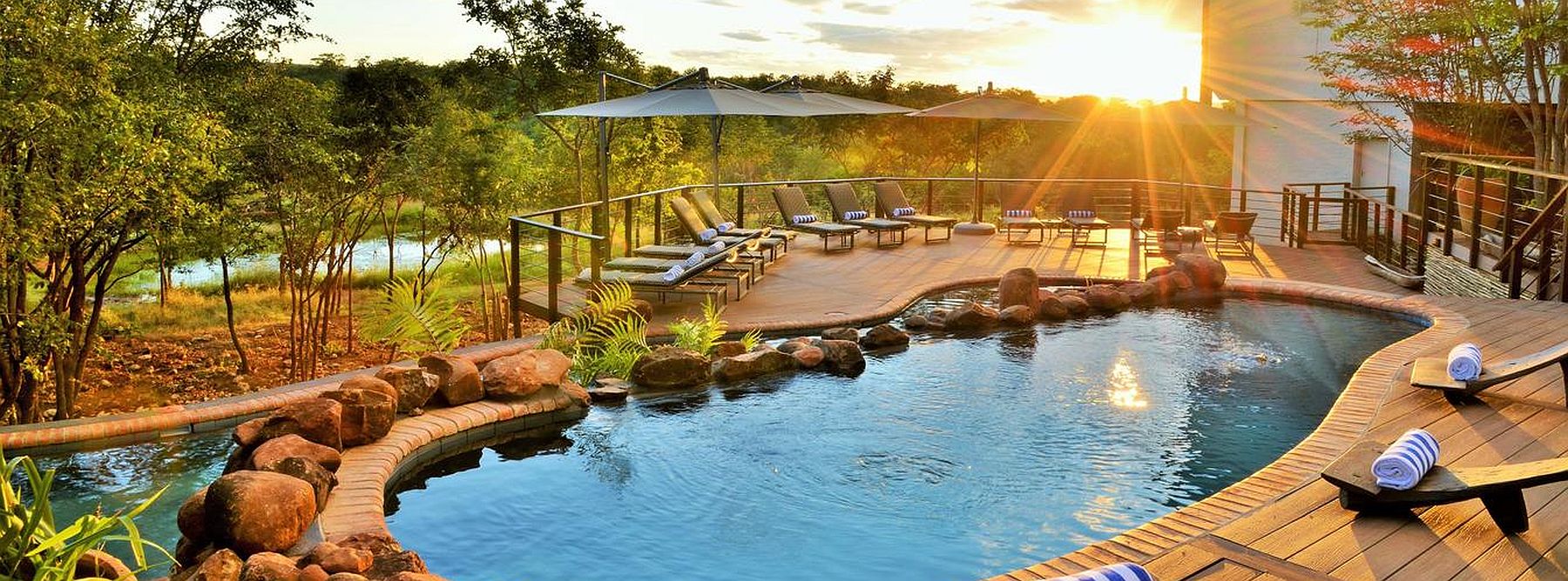 The luxury Victoria Falls Safari Club is an exclusive 20 bedroom lodge situated within the magnificent grounds of the Victoria Falls Safari Lodge, overlooking a private waterhole. The Safari Club lies just 4 km from the thundering Victoria Falls on the Zimbabwe side. It has its own waterhole so that you can enjoy game viewing without stepping a foot outside the lodge. Watch the breathtaking African sunset and view the game coming to drink at the waterhole from your private balcony, pool deck or restaurant.