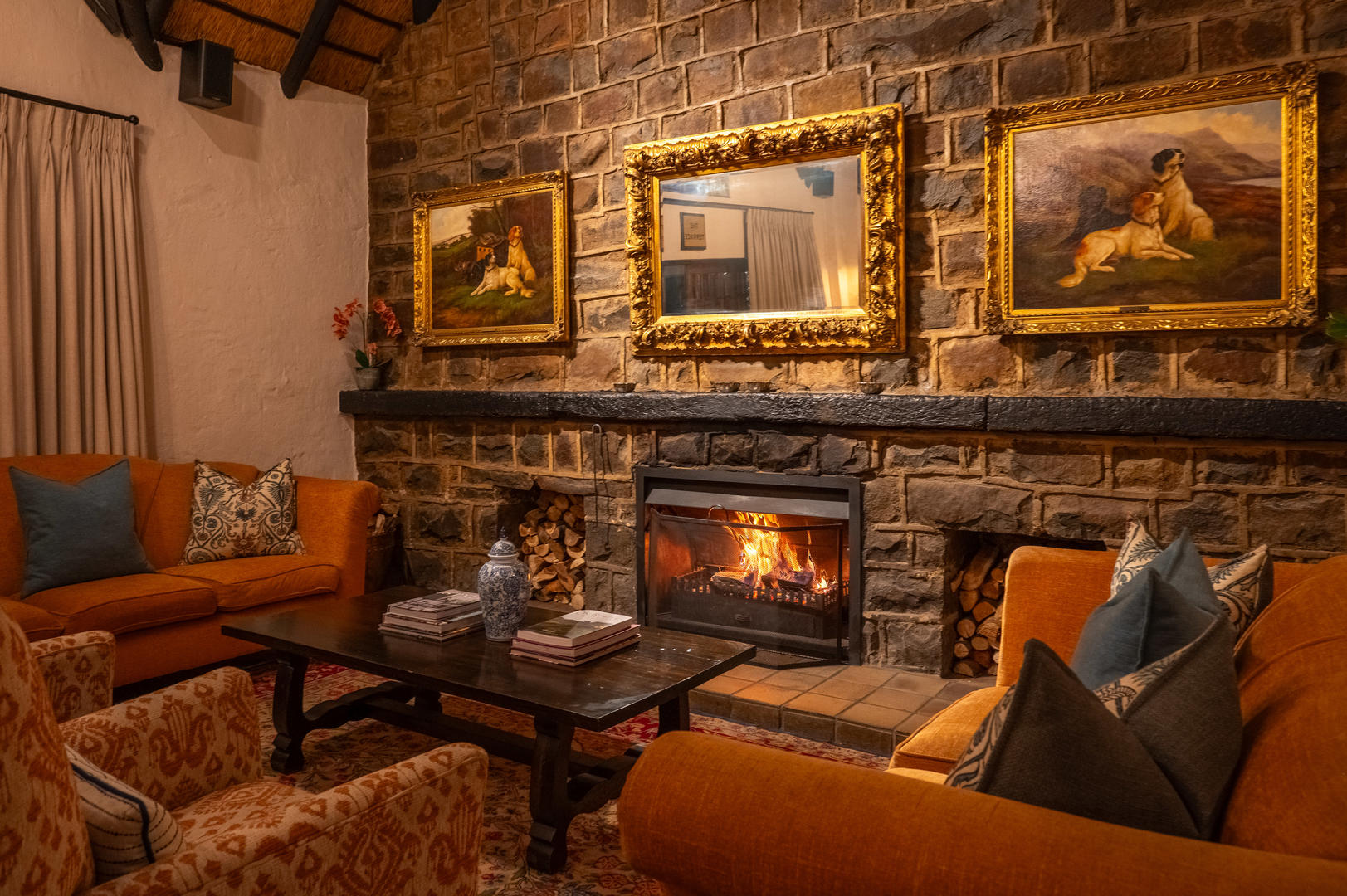The manor house is traditional in style, reminiscent of a Scottish hunting lodge with a formal a la carte dining room, comfortable sitting room, bar and a more casual dining room. Meals can also be taken outside on the terrace. Handpicked antiques and fine paintings grace public areas of the manor house.