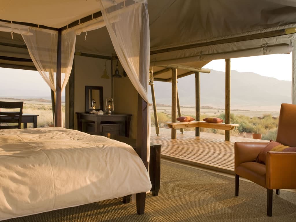 Wolwedans Dune Camp is positioned on the edge of a 250m high dune and sleeps 16 guests in a totally unspoilt desert setting. You stay in comfortable tents pitched on wooden platforms, each furnished with standard beds (with down duvets), bedside tables and a suitcase rack. A spacious veranda allows for safe sleep-outs under the stars, and your en suite bathroom has a hot shower, two washbasins and flush toilet making for a rather civilized camping experience.