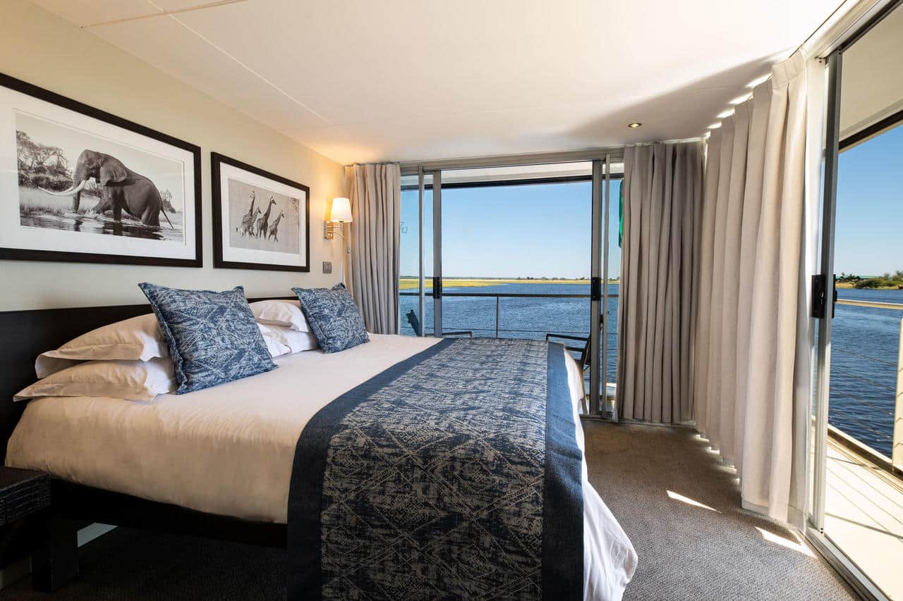 Choose between 8 suites and 6 master suites on the Zambezi Queen. All are light and airy with privxze beds (can be divided into twin beds), furnished to the highest level. En suite's bathroom consist of shower, toilet, mirror, vanity basin with hairdryer. Two of the four Master Suites have their own private deck with outdoor furniture. The remaining suites having superb panoramic views with doors and windows on two sides. All have private balconies, full length sliding shutters for privacy and protection from the sun, sliding mosquito net doors, fans and safes. Four of the suites have a sleeper couch to accommodate a child.