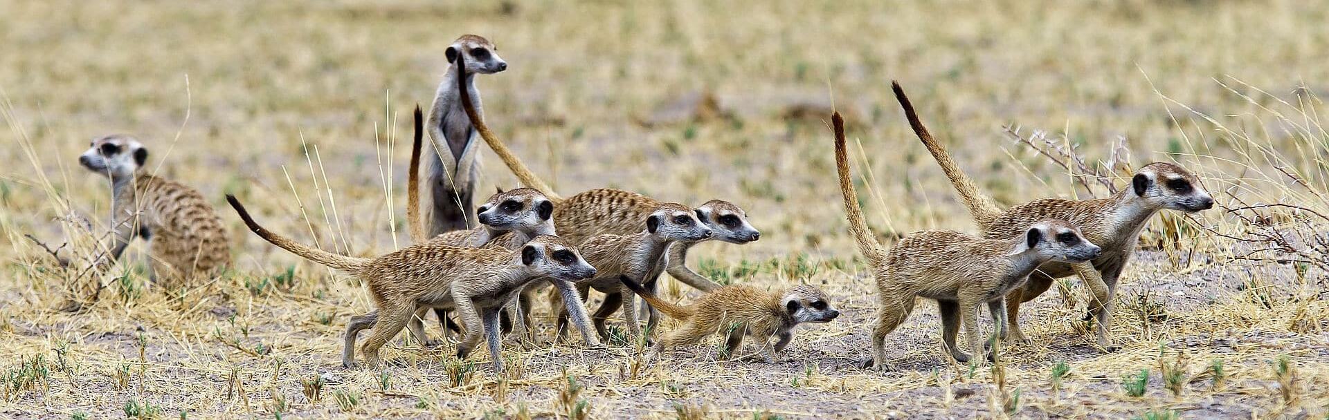 During foraging, at least one meerkat (called a sentinel/sentry) will find a high spot such as a tree branch or termite mound to keep a lookout for predators. While the others dig around for food, the sentinel will sit upright, scanning the sky for eagles and hawks, and the desert for jackals. If danger is sensed, it will alert the rest of the mob with a high-pitched call. The foragers then scatter for cover in their boltholes. Mob members, in no particular order, take turns to keep watch. Talk about teamwork!