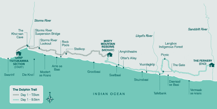 The Dolphin Trail is a luxury and fully portered hiking or slackpacking trail along the Tsitsikamma coastline. Β A beautiful part of the Garden Route. This unique trail allows you to sample some of the coastal scenery seen on the Otter Trail without the hardship of having to carry your own gear and sleep in basic huts!