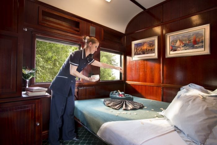 The Observation car allows you to watch the unfolding scenery of the great interior of South Africa from a fascinating perspective. Whilst the air-conditioned Lounge Cars invite you to relax with a book or afternoon tea. Deep sofas and wingback chairs create a space of quiet indulgence and to enjoy the camaraderie of fellow travellers. The lounges are air-conditioned but you can also open the windows to allow in the sights, sounds, and scents of Africa.
