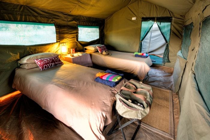 Serviced Camping in en-suite tents on a mobile safari. A serviced (mobile) safari has walk in ensuite meru style tents complete with your own bucket shower and bush loo, staff who prepare delicious meals throughout your safari and a camp assistant to take care of all camp duties.