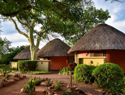 This is an unpretentious, moderately-priced lodge, with traditional rondavel-style rooms. Important to note that they only have outside showers, which may be a little chilly in winter! Rooms can accommodate a 3rd adult (on an extra bed). Alternatively they have 2 sets of inter-leading family rondavels, each with en-suite bathroom. These can also sold individually (as each room has an en-suite bathroom).